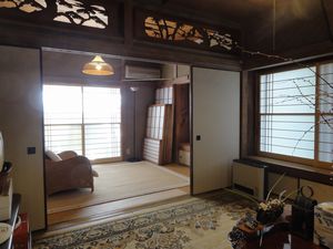 幅広猫間(雪見)障子に雲竜紙を張りました